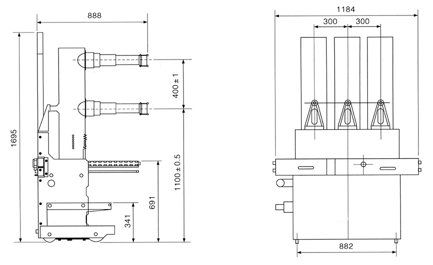 三相灭弧室和相联带电体由三只独立的环氧树脂绝缘筒相隔离,构成复合绝缘结构,断路器满足正常运行条件下的空气距和爬距要求,并有效地减小了断路器的体积。主导电回路真空灭弧室和动静导电联接安装在绝缘筒内,使相间距仅为300mm。主回路电气连接全部采用固定式连接,具有很高的可靠性。绝缘筒安装在断路器框架上方。
