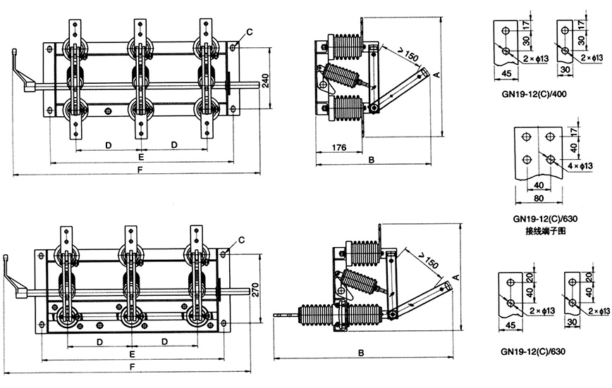 GN19-12型户内高压隔离开关系高压开关设备,用于额定电压12KV,交流50Hz及以下电力系统中,配用CS6-1型人力操作机构,作为在有电压而无负载的情况下,分,合电路之用,亦有派生产品防污型,高原型的和加装带电显示装置等。