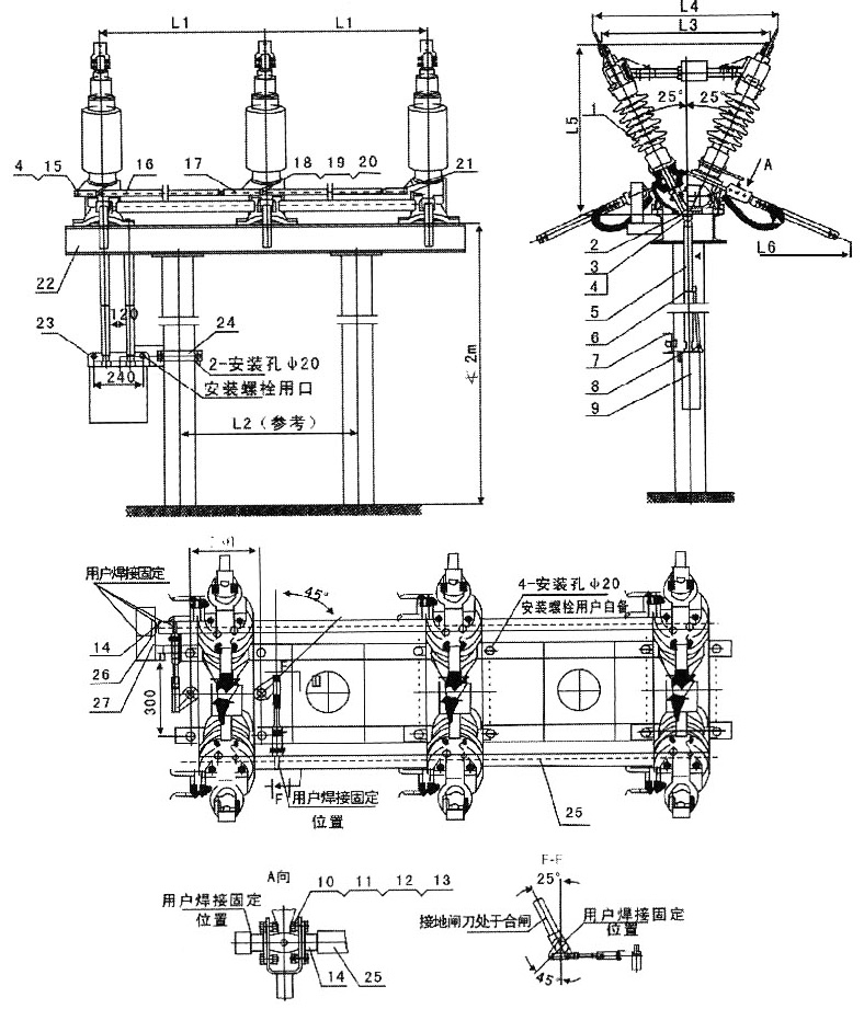 6、根据用户的方便,操动机构可以安装在任一极的下方,操动效果一样。