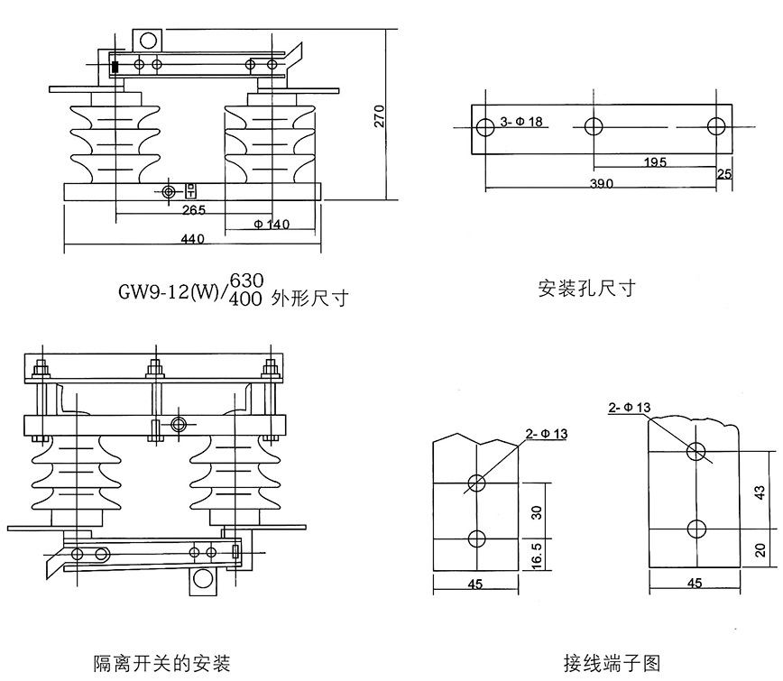 GW9型户外高压隔离开关为交流50Hz的户外高压电器设备,额定电压等级有10kV,15kV,24kV供高压线路在无负载情况下进行开合,以及对被检修高压母线、断路器等电气设备带电的高压线路进行电气隔离之用,也可用于开、合小的电容或电感电流。