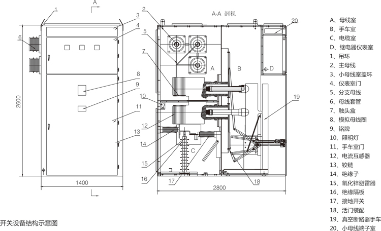 本开关设备具有电缆进出线、架空进出线、母线联络、隔离、电压互感器、避雷器等主电路方案。母线采用复合绝缘,相间及连接头配有用阻燃材料注塑而成的绝缘套,主母线相邻柜间用母线套管隔开,能有效地防止事故蔓延,同时对主母线起到辅助支撑作用。电缆室装有接地开关、过电压保护装置等。