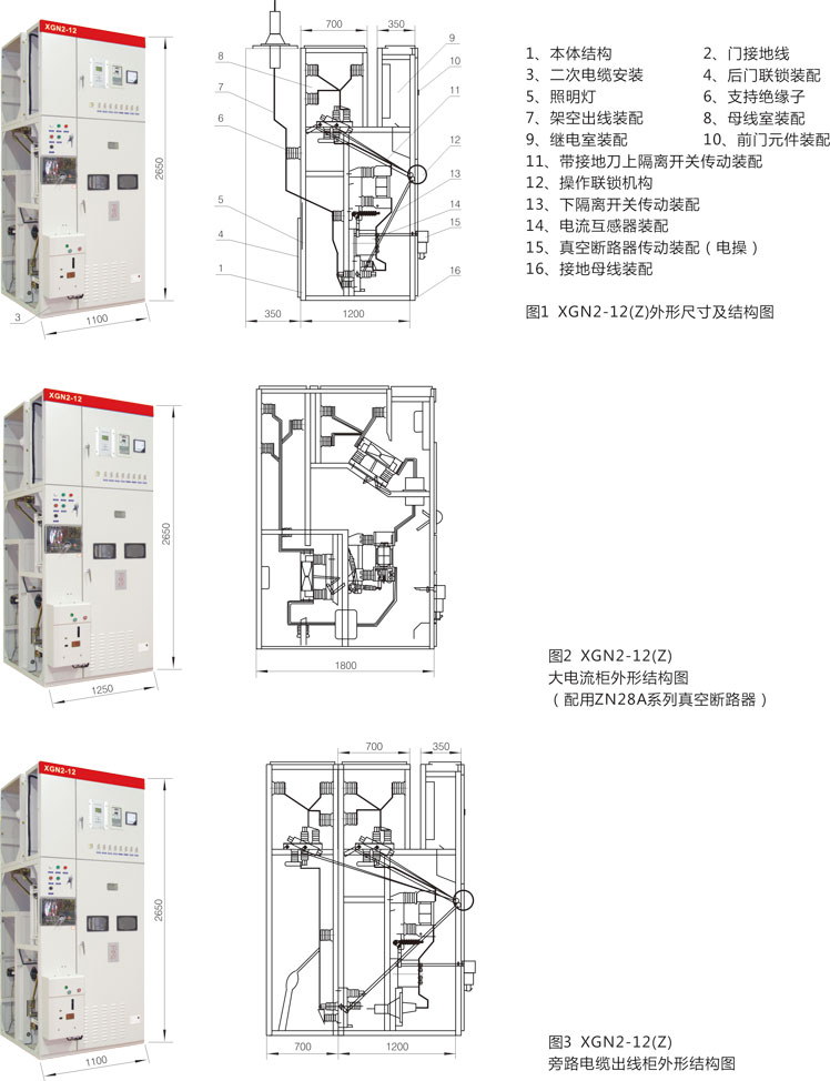 XGN2-12(Z)开关柜为金属封闭箱式结构,柜体骨架由角钢焊接而成,柜内分为断路器室、母线室、电缆室、继电器室等,室与室之间用钢板隔开。