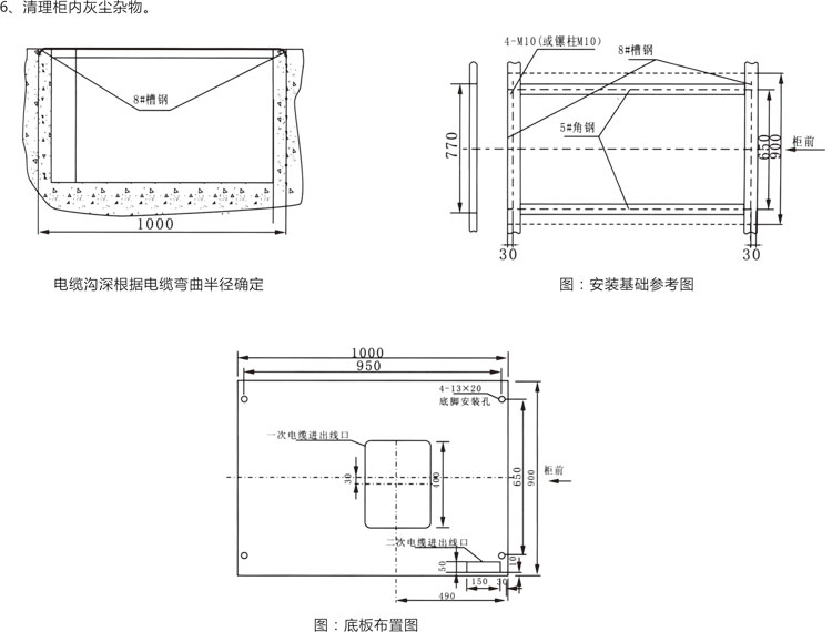 ◎ 将开关柜按顺序放置于基础上,调整好安装的位置,然后用M12螺栓或者用点焊方法进行固定死,柜与柜间与M8螺栓并紧。